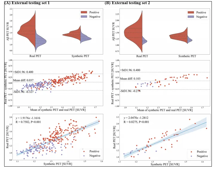 诊断一致性突出:在外部测试中,基于合成图像判读Aβ状态的总体准确率达88.5%,在AD患者中准确率高达96.5%。