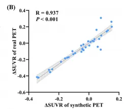 动态监测潜力初现:合成图像在为期6个月的随访中,成功反映出与真实PET高度一致的Aβ变化趋势(R = 0.937)。