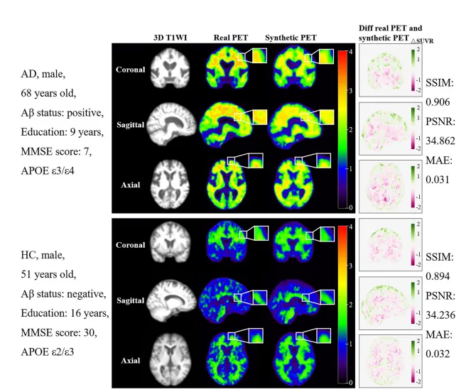 图像合成质量优异:合成图像与真实PET在结构上高度一致(结构相似性指数SSIM > 0.89),视觉效果逼真。